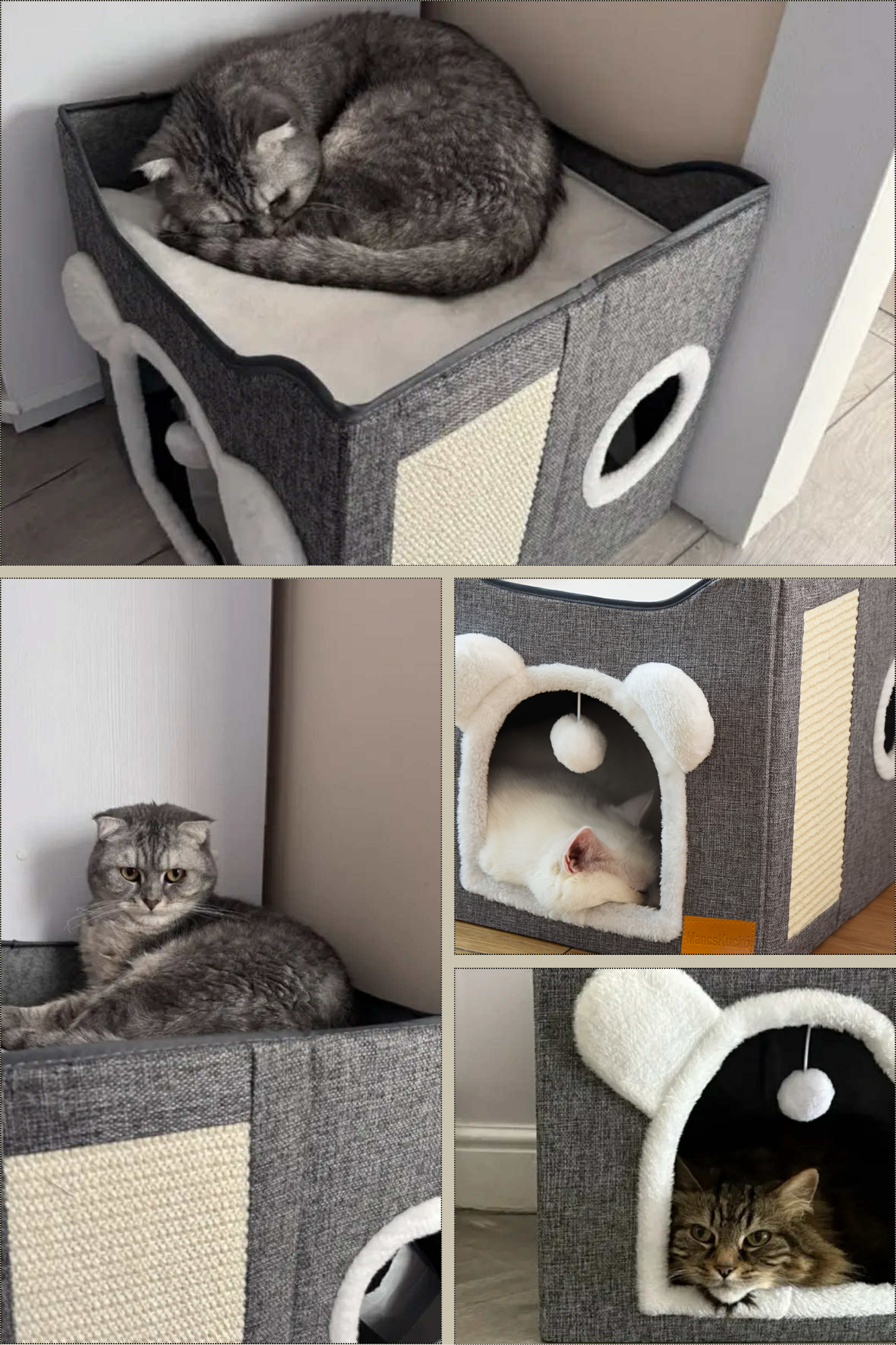 Ez a kis kuckó nemcsak otthonos alvóhelyet kínál kedvencednek, de egyben tökéletes kaparótorony is, ahol kedvére nyújtózhat és élezheti a karmait – a bútorok kímélése érdekében!
